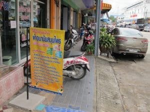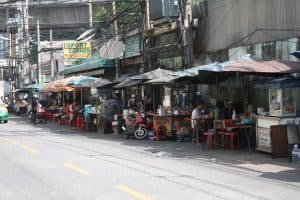 Las calles y veredas de Bangkok (y de casi todo el país) son un desaste. Muchas veces la vereda es inexistente, pues hay vendedores que la ocupan con puestos de venta de comida, mesas, sillas, carteles de propaganda, y demás.