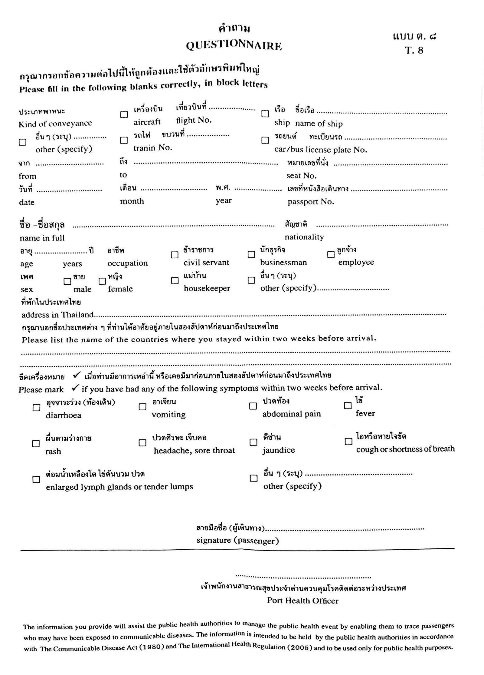 La ley de Health Control (que no tiene nada que ver con Migraciones sino que esta escrita y bajo la jurisdicción del กรมควบคุมโรค (Ministerio de Salud Publica Tailandesa) establece que cualquier persona que «haya transitado país de riesgo» debe tener el certificado.